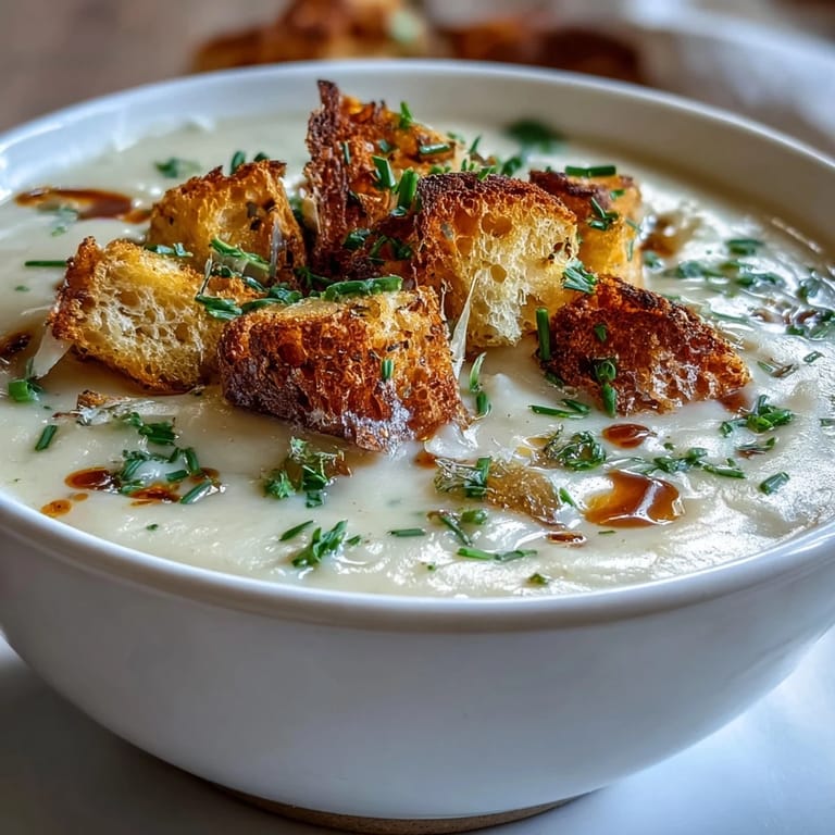 Save to Pinterest Leek and potato soup has long been a staple of European home cooking — humble in its origins yet endlessly satisfying in its execution. The secret lies in treating each ingredient with care: sautéing the leeks and onion slowly so they soften without browning, simmering the potatoes until they are perfectly tender, and blending everything into a smooth, creamy base before stirring in the cream. The sourdough croutons are not an afterthought — tossed in olive oil, dried thyme, and sea salt, then baked until deeply golden, they are every bit as important as the soup itself.