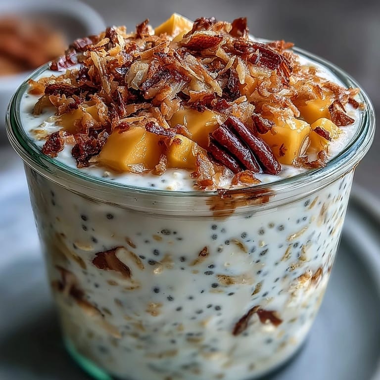 Save to Pinterest There's something about summer mornings that makes you crave something bright and unexpected. My partner grabbed a mango from the farmer's market one Saturday, and I found myself layering it into overnight oats with coconut milk, thinking about how we could make breakfast feel like a tiny tropical vacation before the day got chaotic. The chia seeds thickened everything into this silky texture, and when I toasted the coconut the next morning, the smell alone made it worth waking up early.