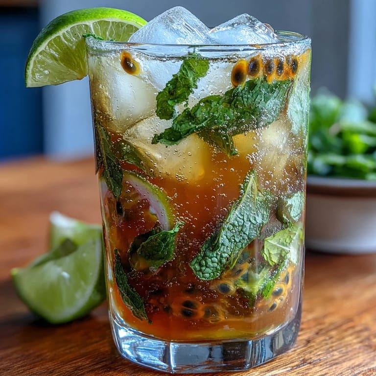 - Garnish with a mint sprig, lime wheel, and a few passionfruit seeds if desired. Serve immediately.